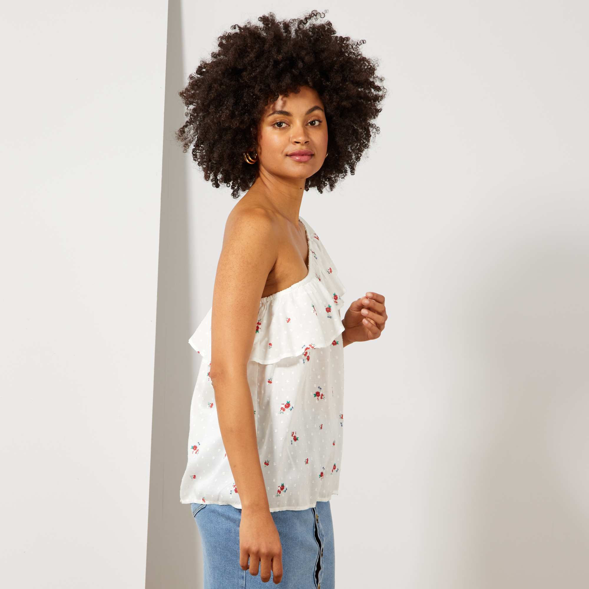 Esta blusa lo tiene todo: corte 'one shoulder', plumeti y estampado floral. ¡Te encantará!
