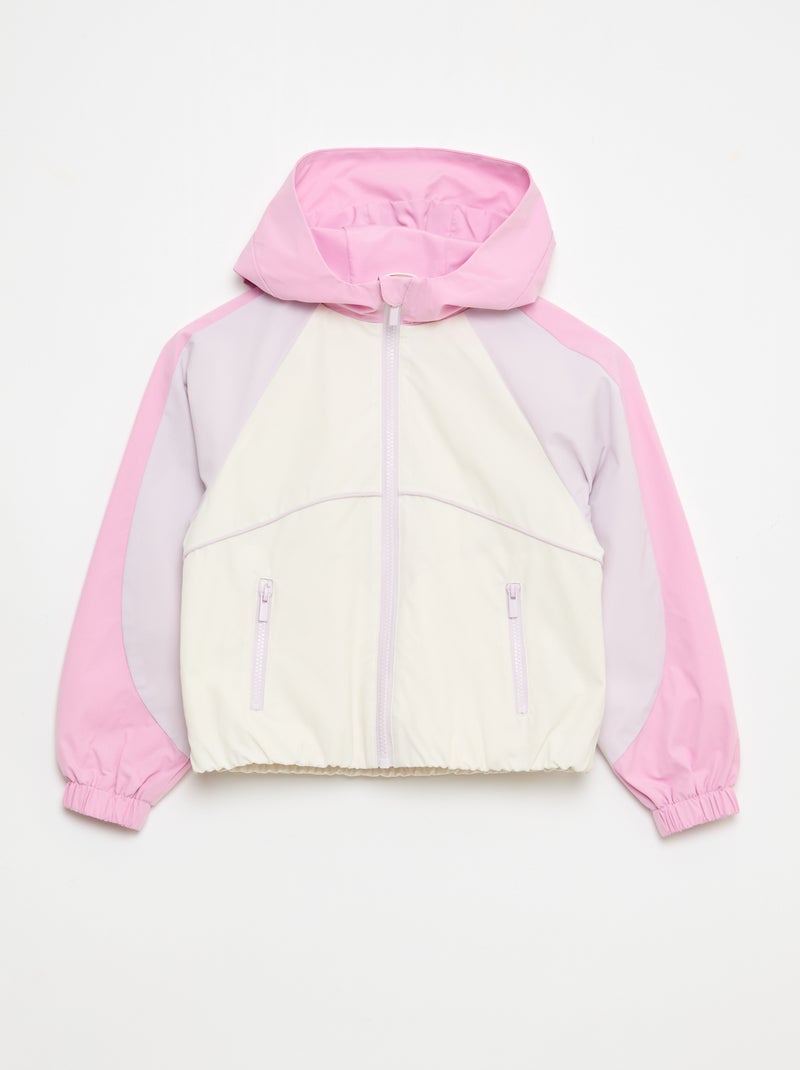 Una cazadora cortavientos con capucha diseñada para proteger del viento y la lluvia, con detalles prácticos.