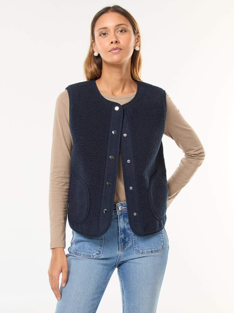 Nos encantan los múltiples detalles de este chaleco sherpa que lo convierten en una prenda de moda infalible.