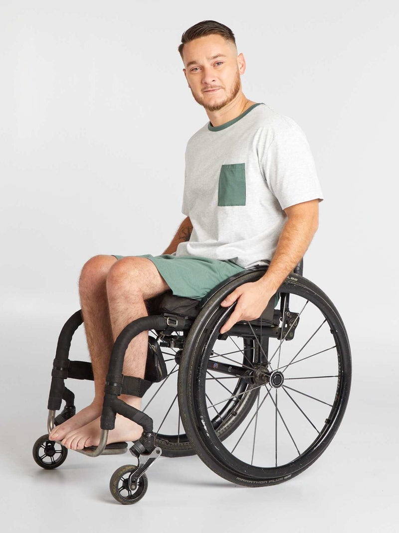 La colección adaptada, diseñada especialmente para los adultos con discapacidad, ofrece prendas divertidas y adaptadas para vestirse más fácilmente. Pijama formado por un short y una camiseta con cierre trasero de automáticos. Esta camiseta ha sido diseñada para los asistentes que se ocupan de una persona con movilidad reducida, ya que permite colocársela por delante sin tener que levantarle los brazos ni hacerle levantarse.