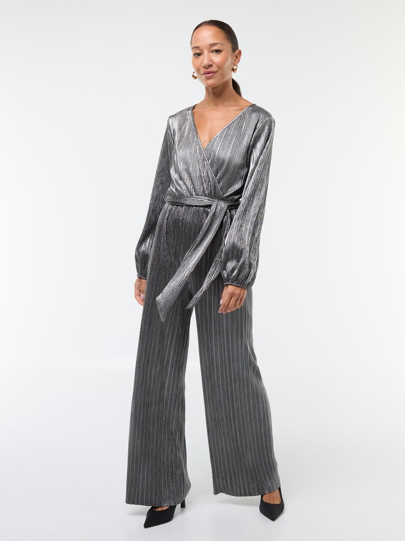 ¡El mono brillante para las grandes ocasiones! - Mono - En punto plisado - Cuello de pico - Mangas largas ajustadas - Cintura con cinturón anudado - Perneras anchas - Efecto brillante - Largo de entrepierna: 80 cm aproximadamente - Ancho del bajo de la pierna: 32 cm aproximadamente - Nuestra modelo lleva una talla S y mide 1,75 m