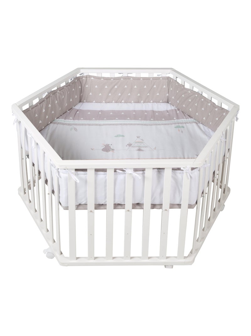 ROBA Parque infantil hexagonal en madera "Indibear" + alfombra de parque y ruedas con freno - Blanco - Blanco